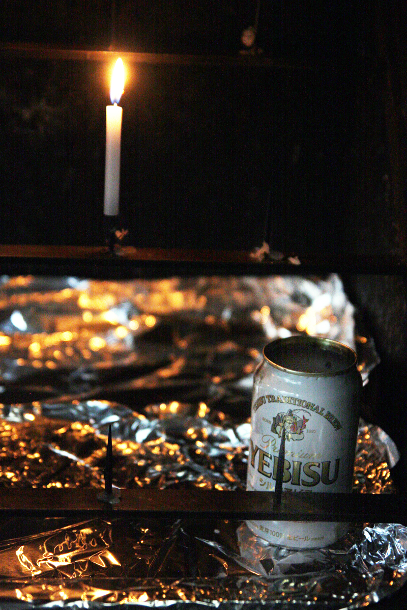 I came across this temple while walking around in Kyoto, I don't know its real name or what it is dedicated to, but there were many beer cans scattered here and there. Not the trash kind of beer cans. It is quite common in Japan to find offerings of beer or sake on ancestors' tombstones, but this seemed a bit different. All Yebisu beer? By the candle stands?